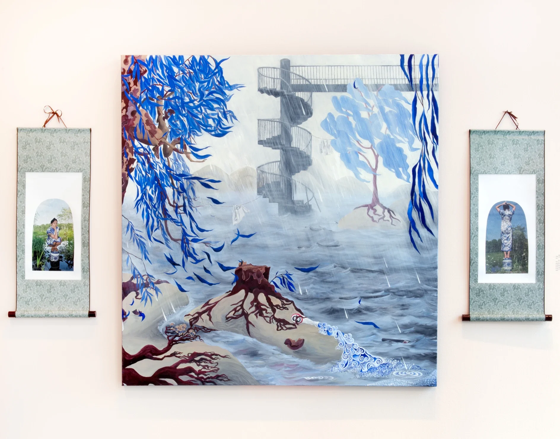 This triptych is a painting paired with photographs of myself in a Chinoiserie dress on top of a ceramic. This lets the ceramic object come out as a living, breathing person.
